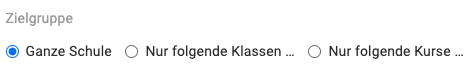 Über den Bereich Zielgruppe können Sie Ihren schulweiten Beitrag gezielt an einzelne Klassen oder Kurse versenden. Damit ist es möglich, dass Sie bspw. einen Beitrag gezielt an alle dritten Klassen Ihrer Schule versenden, indem Sie den Beitrag für die entsprechenden Klassen durch Anwählen der Klasse freischalten.